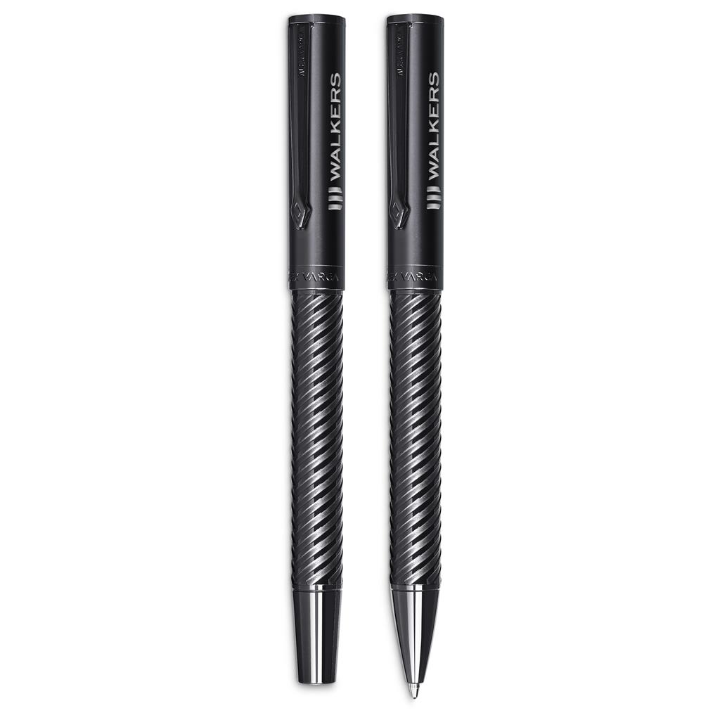 The Alex Varga collection features writing instruments with distinctive yet tasteful designs, and high quality refills and mechanisms. Each piece or set is presented in elegant packaging, making them gifts which are given with pride and confidence. Both pens in this set combine an embossed patterned lower barrel with a smooth, matte black upper barrel. The ball pen is fitted with a refill which has a minimum writing distance of 3,000 Metres. Replacement refills are available (code AV-19029).