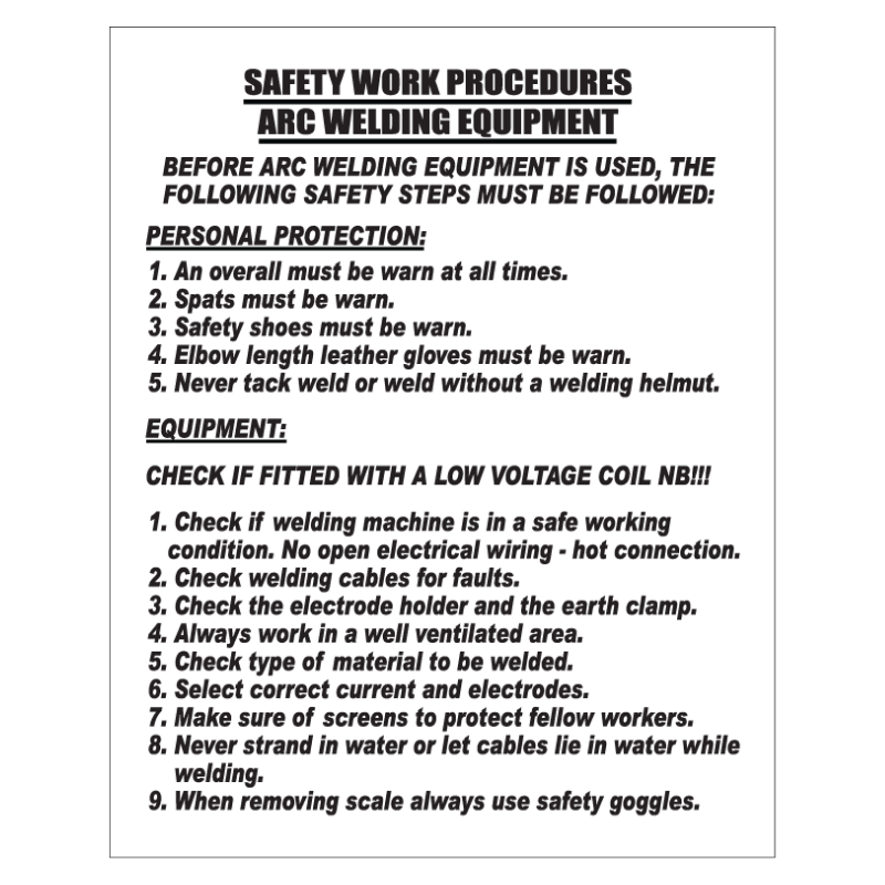 Factory and industrial environments demand clear, durable Arc Welding S.W.P Sign to maintain safety, productivity, and compliance. Our custom factory and industrial signs are designed to meet regulatory standards while improving visibility and communication across manufacturing floors, warehouses, and production sites.