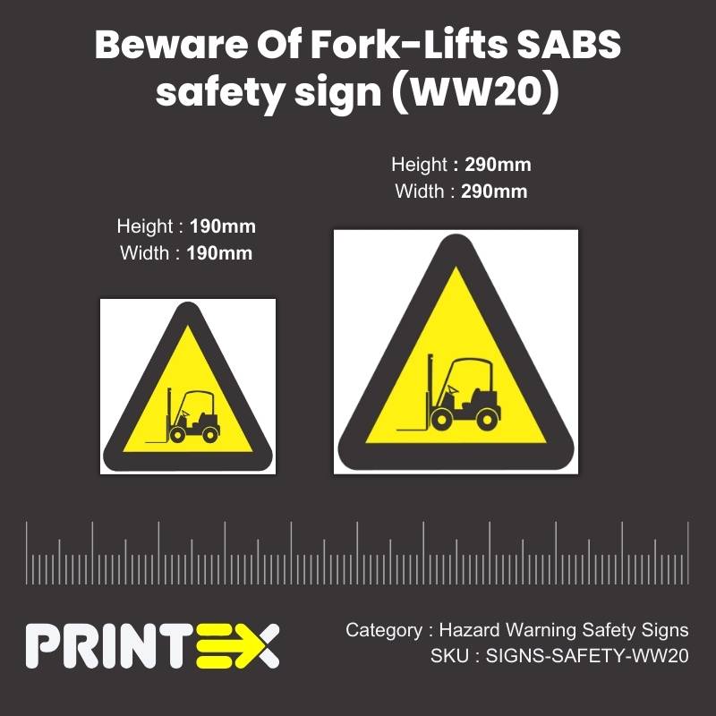 Prevent accidents and promote hazard awareness with SABS-approved Beware Of Fork-Lifts Safety Sign (WW20) in South Africa. These essential safety signs help alert employees, visitors, and the public to potential dangers, ensuring compliance with SANS 1186-1 and OHSA safety regulations. Designed with high-visibility yellow backgrounds and bold black symbols, they provide instant recognition of workplace hazards, reducing the risk of injuries and legal liabilities.