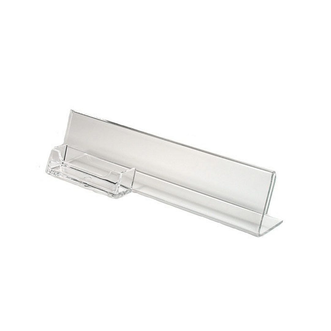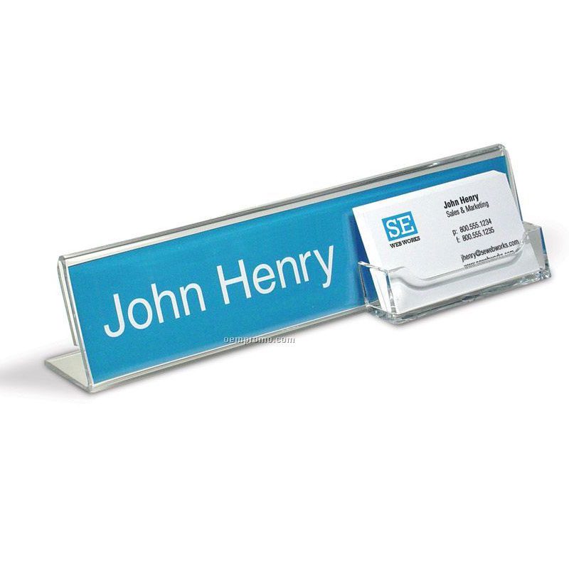 These products have excellent durability, clear visibility, and customization options. Which makes them valuable additions to various environments, including restaurants, hotels, trade shows, and offices. Made of clear acrylic, this Name Plate holder is perfect for any executive desktop. Features a built-in business card holder for standard sized business cards.