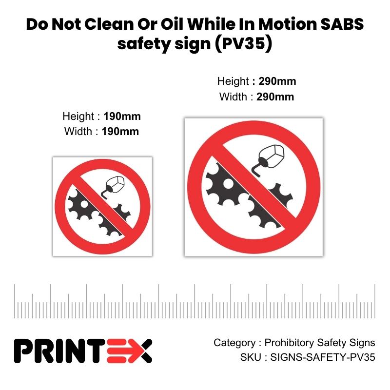 Ensure workplace safety and regulatory compliance with SABS-approved Do Not Clean Or Oil While In Motion Safety Sign (PV35) in South Africa. These signs play a critical role in preventing dangerous actions, restricting unauthorized access, and maintaining order in workplaces, factories, construction sites, and public areas. Designed to meet SANS 1186-1 and OHSA safety regulations, our prohibitory signs use bold red circles with a diagonal line to indicate restricted actions clearly.