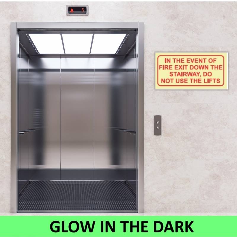 Stay compliant and enhance workplace safety with the SABS In the event of Fire exit down the stairway do not use lifts Photoluminescent sign (F39) that work when you need them most. Order today for peace of mind and SABS-certified quality.