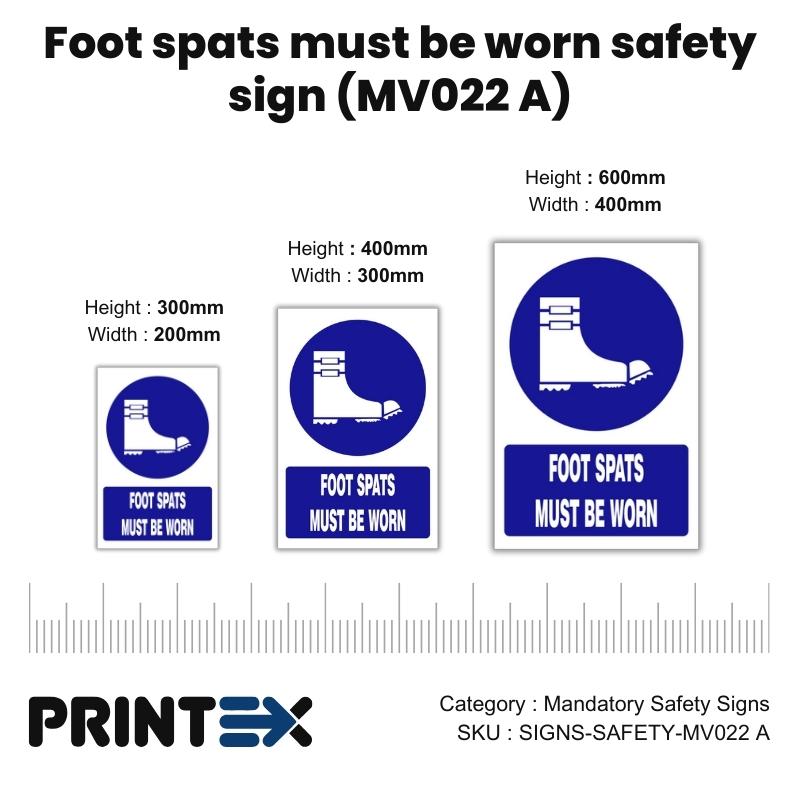 Our SABS-approved Foot spats must be worn safety sign (MV022A) complies with SANS 1186-1 and OHSA standards, ensuring your business meets South African legal safety requirements. Featuring bold blue backgrounds with white pictograms, these signs provide clear instructions on required safety actions to prevent accidents and promote a secure working environment.
