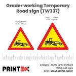 Grader working Temporary Road sign (TW337) are crucial for visually communicating warnings and instructions using universally recognized icons rather than text. These symbol-based traffic signs improve road safety by quickly conveying vital information, especially to non-native speakers, tourists, or in high-speed areas where rapid comprehension is critical.