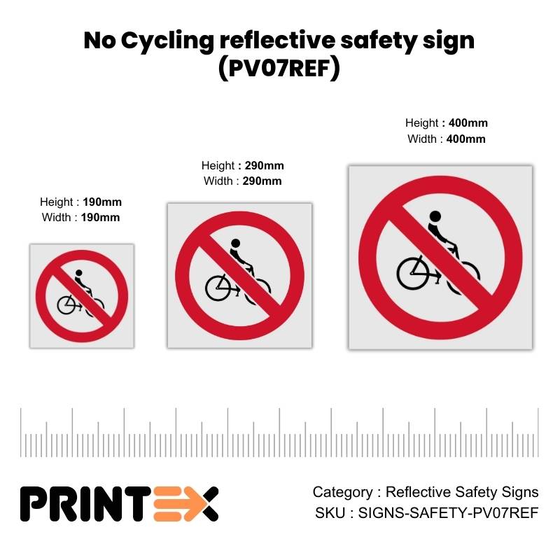 Enhance workplace and road safety with high-quality No Cycling reflective safety sign (PV07REF) made from durable Chromadek steel. Designed for high visibility during the day and night, these signs are ideal for construction sites, warehouses, factories, and public areas where clear safety communication is essential.