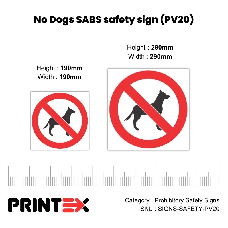 Ensure workplace safety and regulatory compliance with SABS-approved No Dogs Safety Sign (PV20) in South Africa. These signs play a critical role in preventing dangerous actions, restricting unauthorized access, and maintaining order in workplaces, factories, construction sites, and public areas. Designed to meet SANS 1186-1 and OHSA safety regulations, our prohibitory signs use bold red circles with a diagonal line to indicate restricted actions clearly.