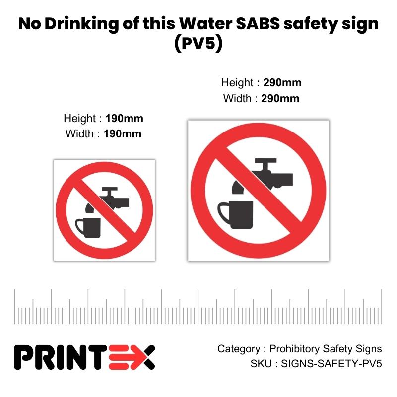 Ensure workplace safety and regulatory compliance with SABS-approved No Drinking Of This Water Safety Sign (PV5) in South Africa. These signs play a critical role in preventing dangerous actions, restricting unauthorized access, and maintaining order in workplaces, factories, construction sites, and public areas. Designed to meet SANS 1186-1 and OHSA safety regulations, our prohibitory signs use bold red circles with a diagonal line to indicate restricted actions clearly.