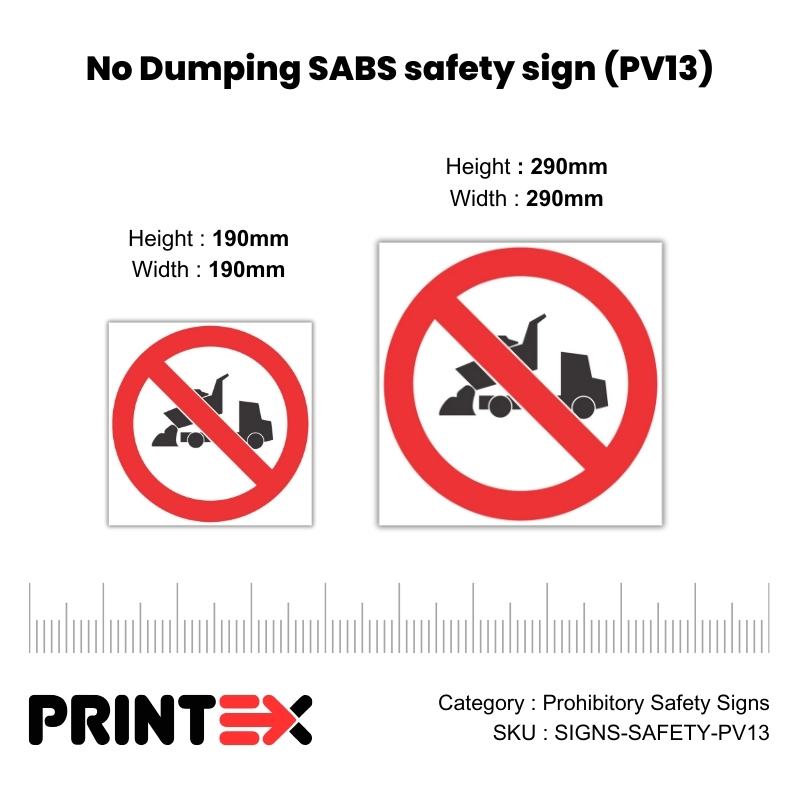 Ensure workplace safety and regulatory compliance with SABS-approved No Dumping SABS safety sign (PV13) in South Africa. These signs play a critical role in preventing dangerous actions, restricting unauthorized access, and maintaining order in workplaces, factories, construction sites, and public areas. Designed to meet SANS 1186-1 and OHSA safety regulations, our prohibitory signs use bold red circles with a diagonal line to indicate restricted actions clearly.