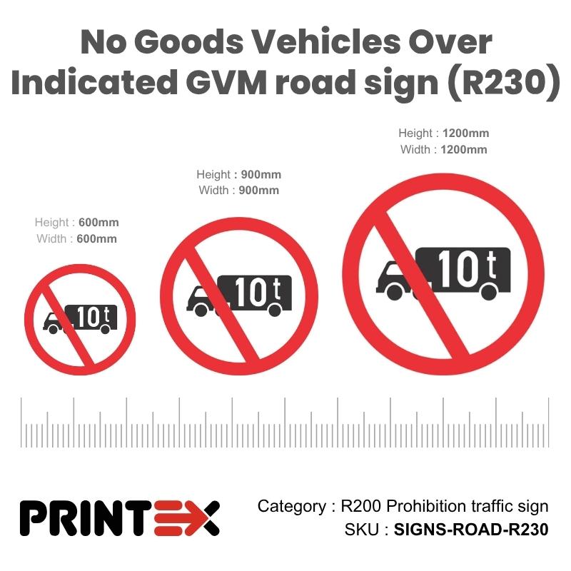 No Goods Vehicles Over Indicated Gvm Road Sign (R230) are essential for maintaining safety and order on South African roads. These traffic signs are used to indicate actions that are legally prohibited for drivers and pedestrians. From “No Entry” to “No U-Turn” and “No Overtaking,” these signs are critical for enforcing traffic laws, reducing road hazards, and ensuring smooth traffic flow.