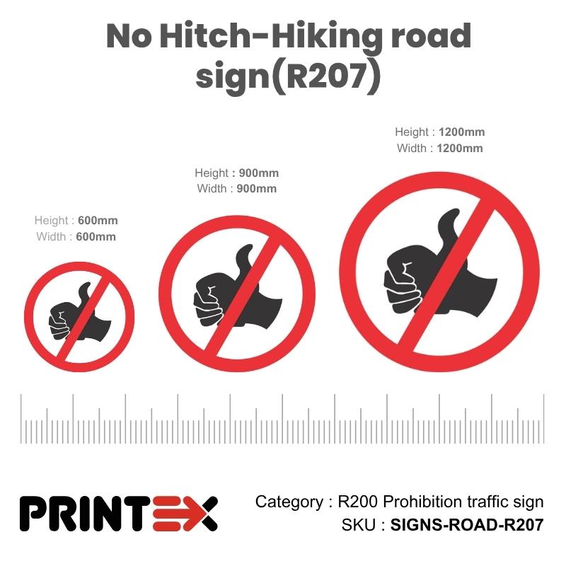 No Hitch-Hiking Road Sign(R207) are essential for maintaining safety and order on South African roads. These traffic signs are used to indicate actions that are legally prohibited for drivers and pedestrians. From “No Entry” to “No U-Turn” and “No Overtaking,” these signs are critical for enforcing traffic laws, reducing road hazards, and ensuring smooth traffic flow.