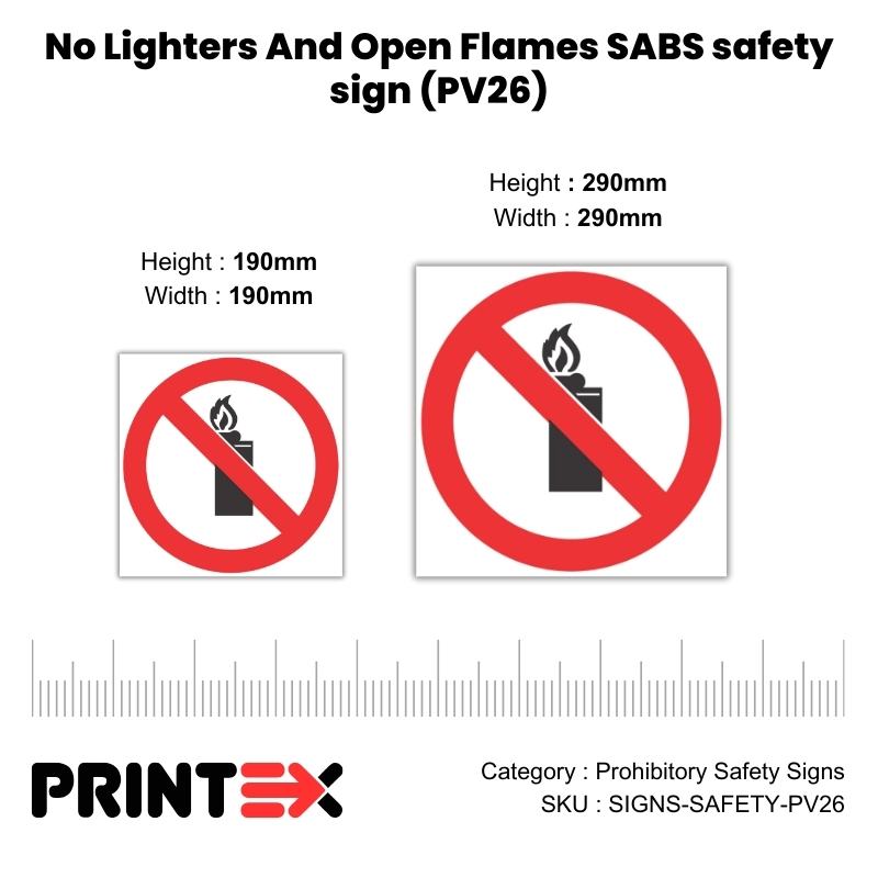 No Lighters And Open Flames Safety Sign (Pv 26) or Lighters and Open Flames Prohibited safety sign. This sign indicates that lighters, matches and open flames are not allowed. It is crucial that in areas where flammable materials are stored or used that it is always adequately marked.