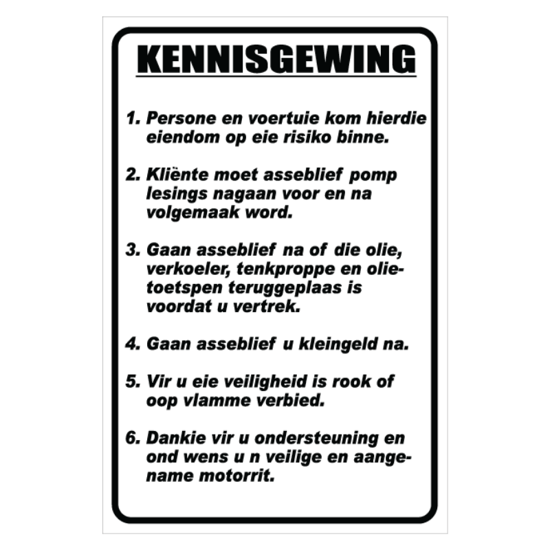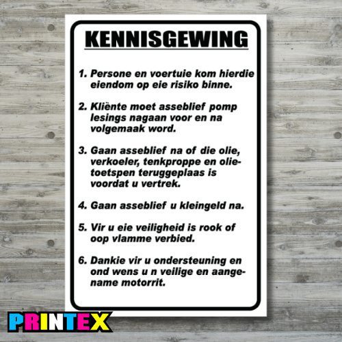 Enhance your workspace with professionally designed Notice Garage Afrikaans Sign that deliver both function and style. From directional signs and room names to branding displays and safety notices, office signage plays a crucial role in shaping your brand identity, guiding staff and visitors, and ensuring workplace compliance.