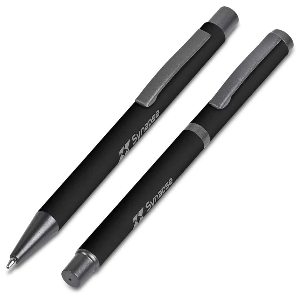 The Omega Ball Pen & Rollerball Set is a refined executive stationery gift designed for corporate gifting, client appreciation, and premium promotional campaigns. With its modern rubberised finish and sleek gunmetal detailing, this set delivers a professional look with a high-quality tactile writing experience.