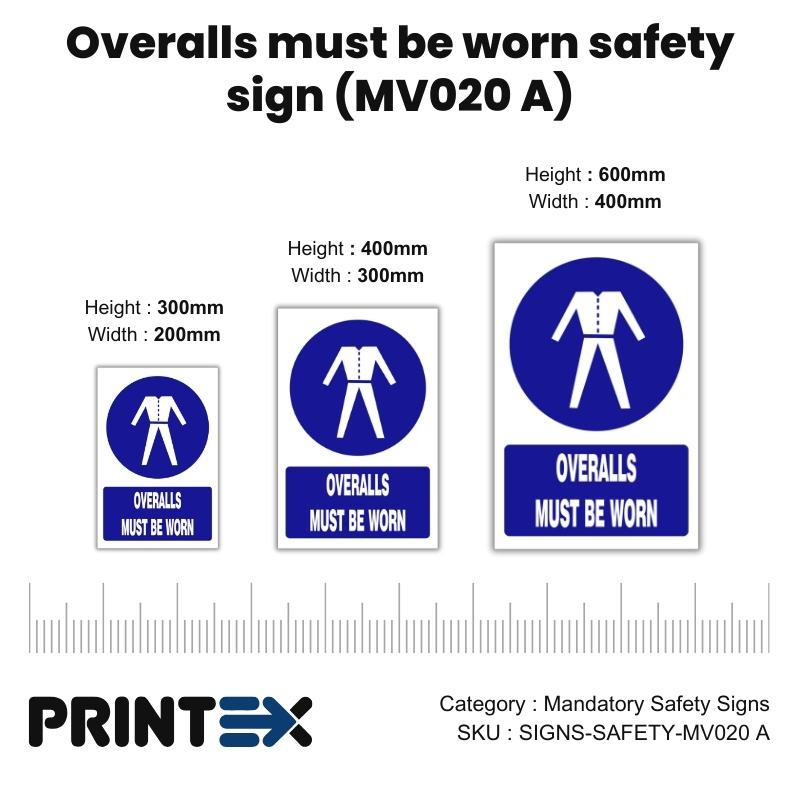 Our SABS-approved Overalls must be worn safety sign (MV020A) complies with SANS 1186-1 and OHSA standards, ensuring your business meets South African legal safety requirements. Featuring bold blue backgrounds with white pictograms, these signs provide clear instructions on required safety actions to prevent accidents and promote a secure working environment.