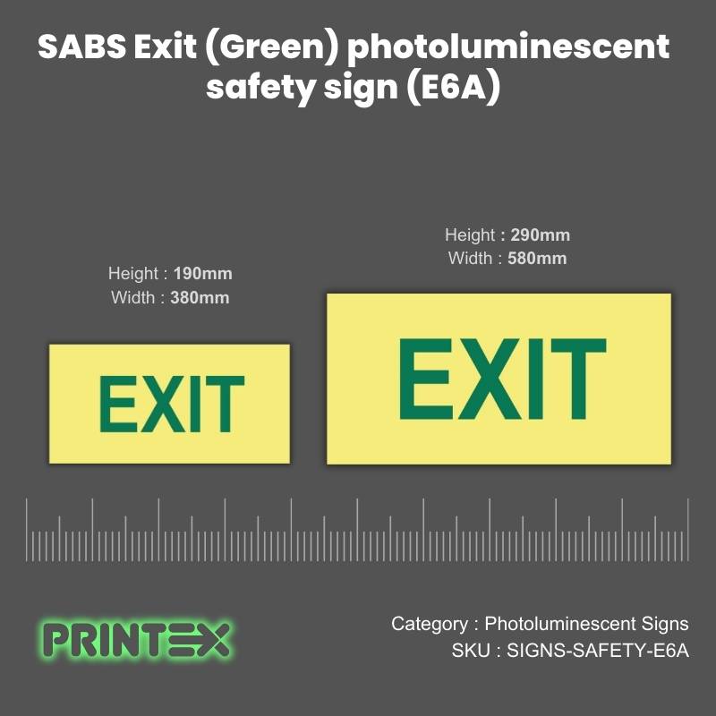 Stay compliant and enhance workplace safety with the SABS Exit (Green) photoluminescent safety sign (E6A) that work when you need them most. Order today for peace of mind and SABS-certified quality.