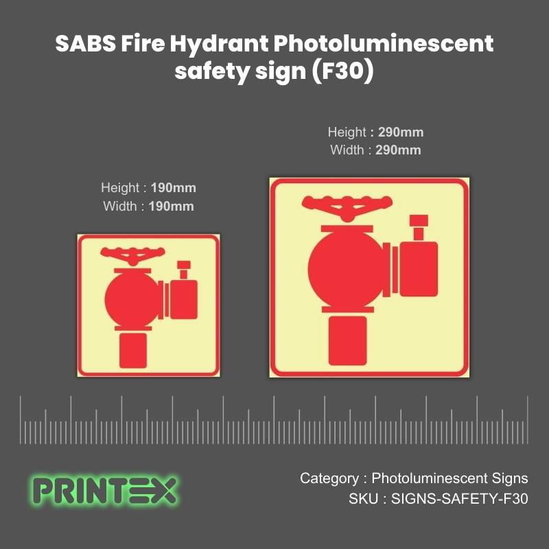 Stay compliant and enhance workplace safety with the SABS Fire Hydrant Photoluminescent Sign (F30) that works when you need them most. Order today for peace of mind and SABS-certified quality.