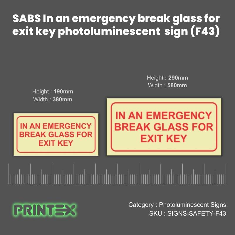 Stay compliant and enhance workplace safety with the SABS In An Emergency Break Glass For Exit Key Photoluminescent Sign (F43) that work when you need them most. Order today for peace of mind and SABS-certified quality.