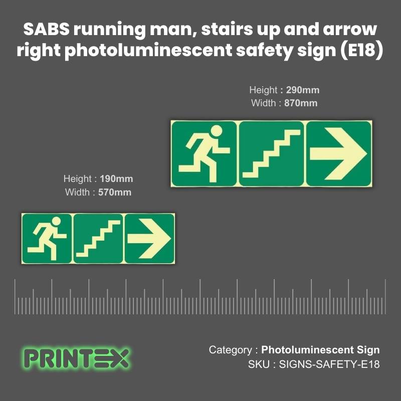 Stay compliant and enhance workplace safety with the Running Man Right Stairs Up Right & Arrow Photoluminescent Sign that work when you need them most. Order today for peace of mind and SABS-certified quality.