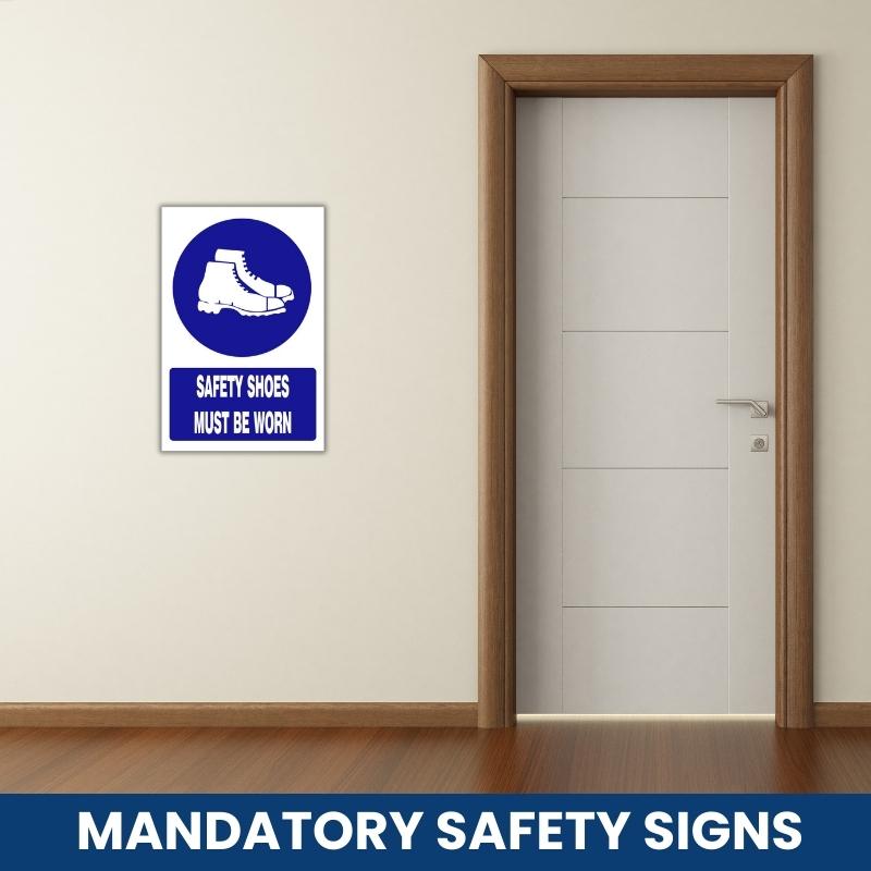 Our SABS-approved Safety Shoes Must Be Worn Safety Sign (MV007A) complies with SANS 1186-1 and OHSA standards, ensuring your business meets South African legal safety requirements. Featuring bold blue backgrounds with white pictograms, these signs provide clear instructions on required safety actions to prevent accidents and promote a secure working environment.