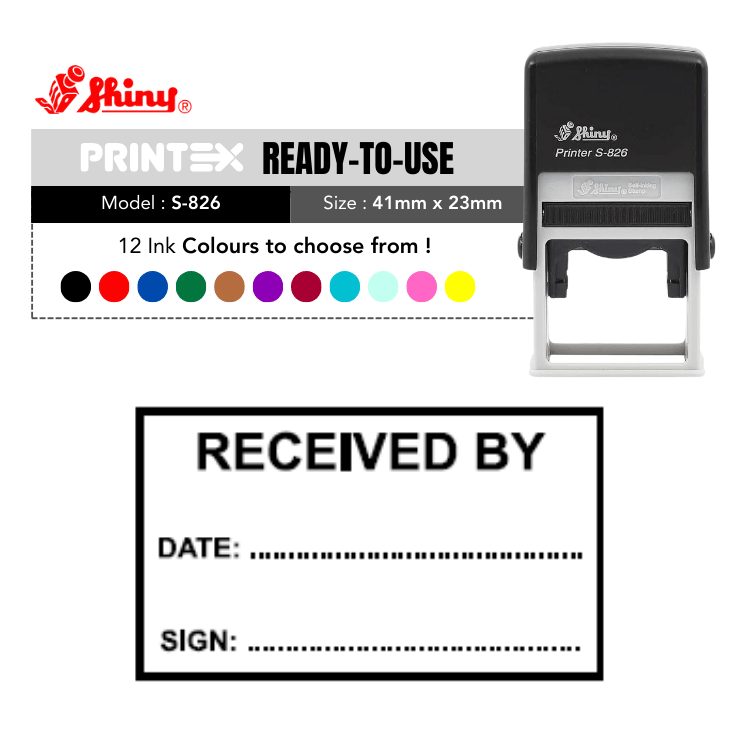 Our Shiny S-826 Ready Made Stamp Received by are designed to provide clear, crisp impressions every time. Perfect for both professional and personal use, these stamps ensure efficiency and precision, saving you time and effort.