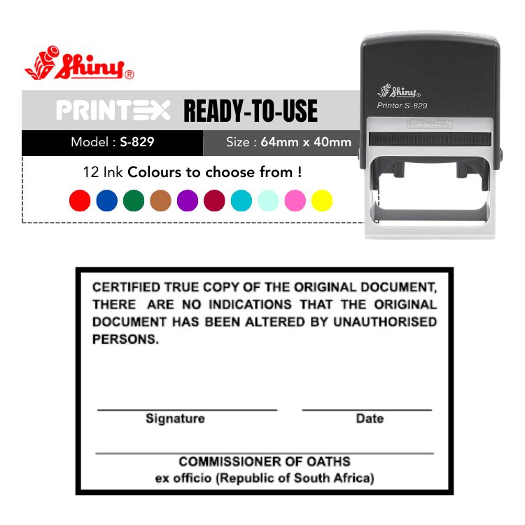 Our Shiny S-829 Ready Made Stamp Commissioner of Oaths are designed to provide clear, crisp impressions every time. Perfect for both professional and personal use, these stamps ensure efficiency and precision, saving you time and effort.
