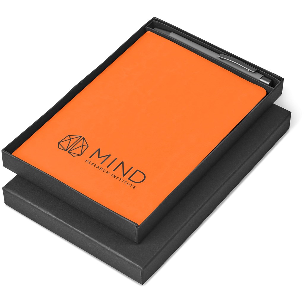 Enhance your brand visibility with the Showtime Notebook & Pen Set from Printex. Whether you need corporate giveaways, branded clothing, or customized accessories, we provide premium products designed to leave a lasting impression.The luxurious feel of this soft cover notebook goes perfectly with the soft-touch coating on the grey barrel of the metal pen. Colour page edges finish the set off perfectly.