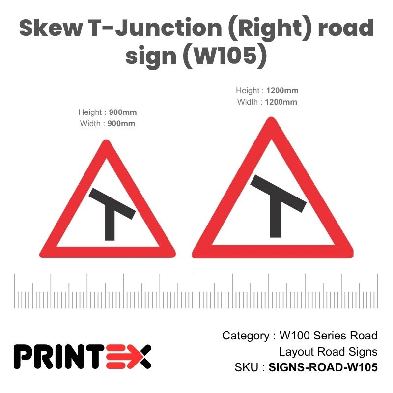 Skew T-Junction (Right) Road Sign (W105) play a critical role in alerting drivers to changes in road direction, layout, or structure. These warning signs improve road safety by giving advance notice of curves, junctions, roundabouts, merging lanes, and other potentially hazardous layouts. Recognized by their yellow diamond shape with bold black symbols, W100 signs are essential for highways, construction zones, and high-traffic intersections.