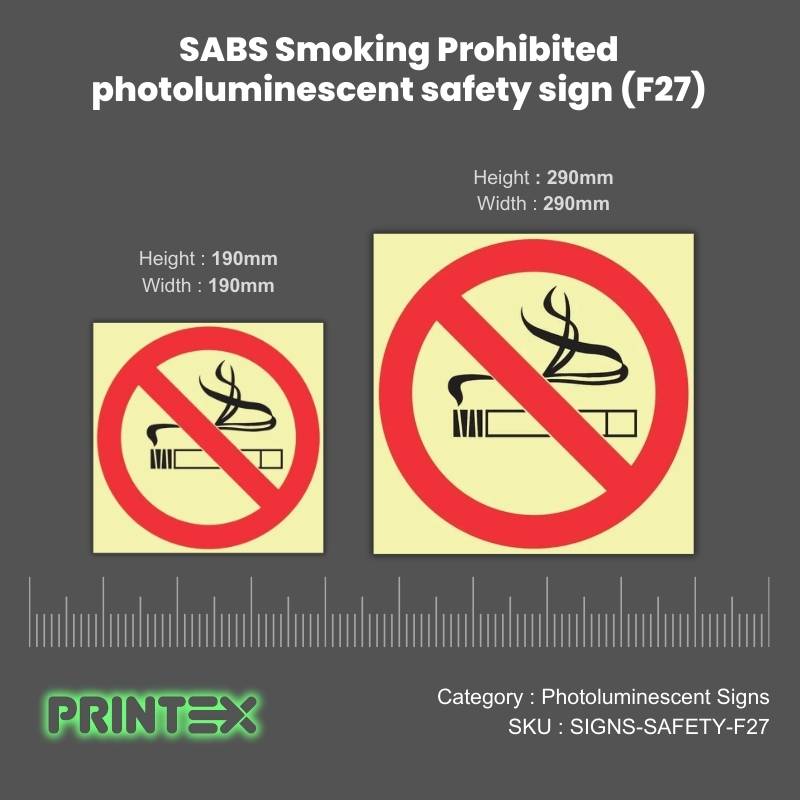 Stay compliant and enhance workplace safety with the SABS Smoking Prohibited Photoluminescent Sign (F27) that work when you need them most. Order today for peace of mind and SABS-certified quality.