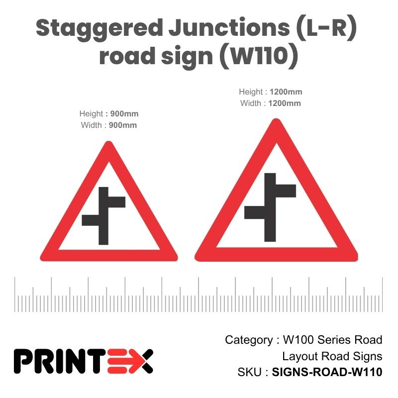 Staggered Junctions (L-R) Road Sign (W110) play a critical role in alerting drivers to changes in road direction, layout, or structure. These warning signs improve road safety by giving advance notice of curves, junctions, roundabouts, merging lanes, and other potentially hazardous layouts. Recognized by their yellow diamond shape with bold black symbols, W100 signs are essential for highways, construction zones, and high-traffic intersections.