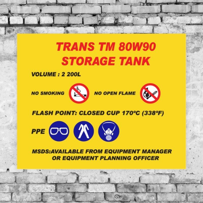 In the mining industry, clear and compliant Trans TM 80W90 Storage Tank Sign is essential to maintaining safety, meeting legal requirements, and improving operational efficiency. Our mining business signs are designed to withstand harsh environmental conditions while communicating vital information to workers, contractors, and visitors.