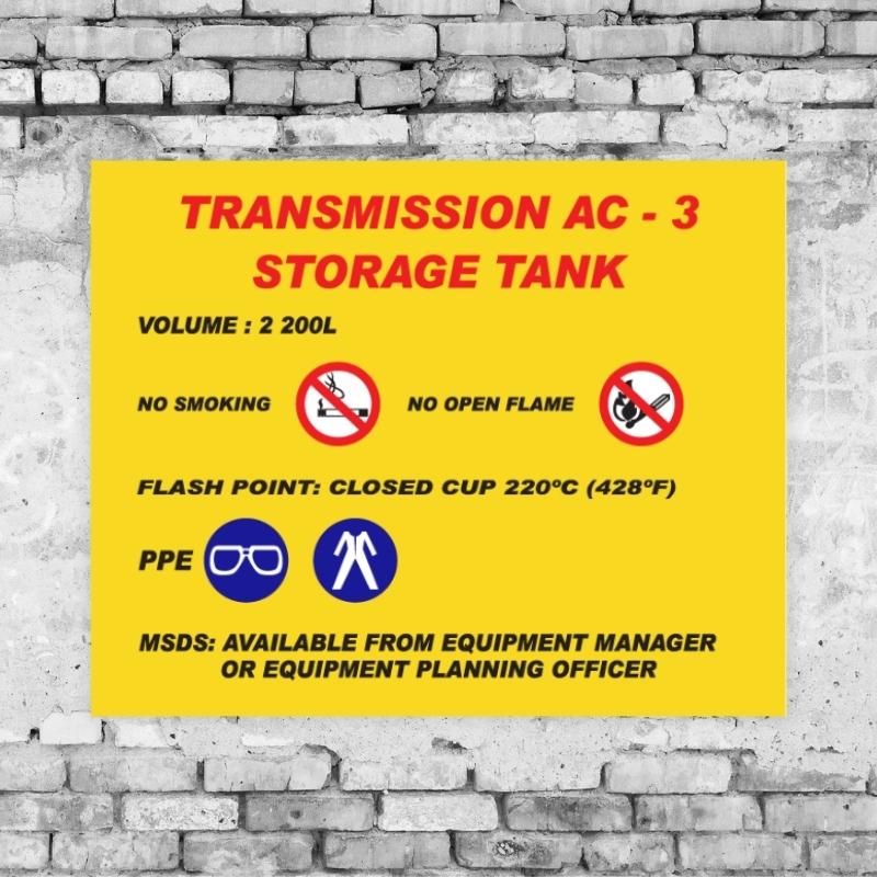 In the mining industry, clear and compliant Transmission AC-3 Storage Tank Sign is essential to maintaining safety, meeting legal requirements, and improving operational efficiency. Our mining business signs are designed to withstand harsh environmental conditions while communicating vital information to workers, contractors, and visitors.