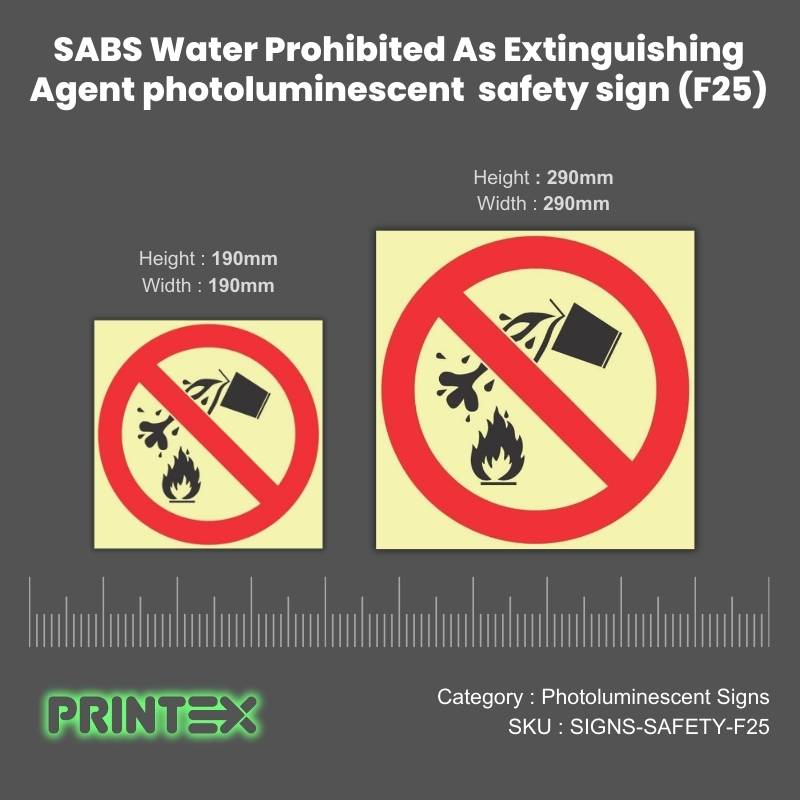 Stay compliant and enhance workplace safety with the SABS Water Prohibited As Extinguishing Agent Photoluminescent Sign (F25) that work when you need them most. Order today for peace of mind and SABS-certified quality.