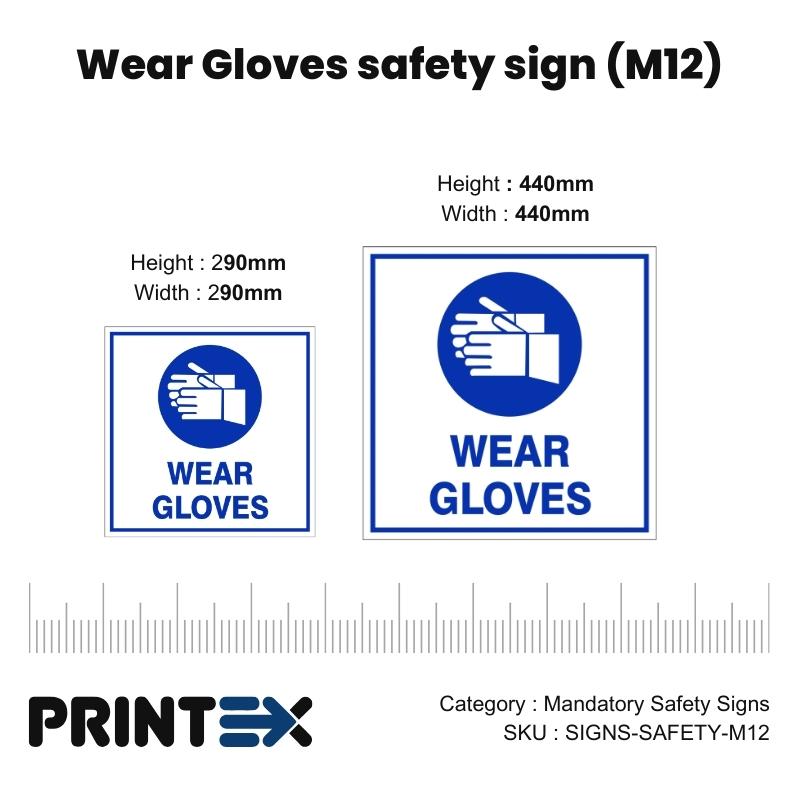Our SABS-approved Wear Gloves Safety Sign (M12) complies with SANS 1186-1 and OHSA standards, ensuring your business meets South African legal safety requirements. Featuring bold blue backgrounds with white pictograms, these signs provide clear instructions on required safety actions to prevent accidents and promote a secure working environment.