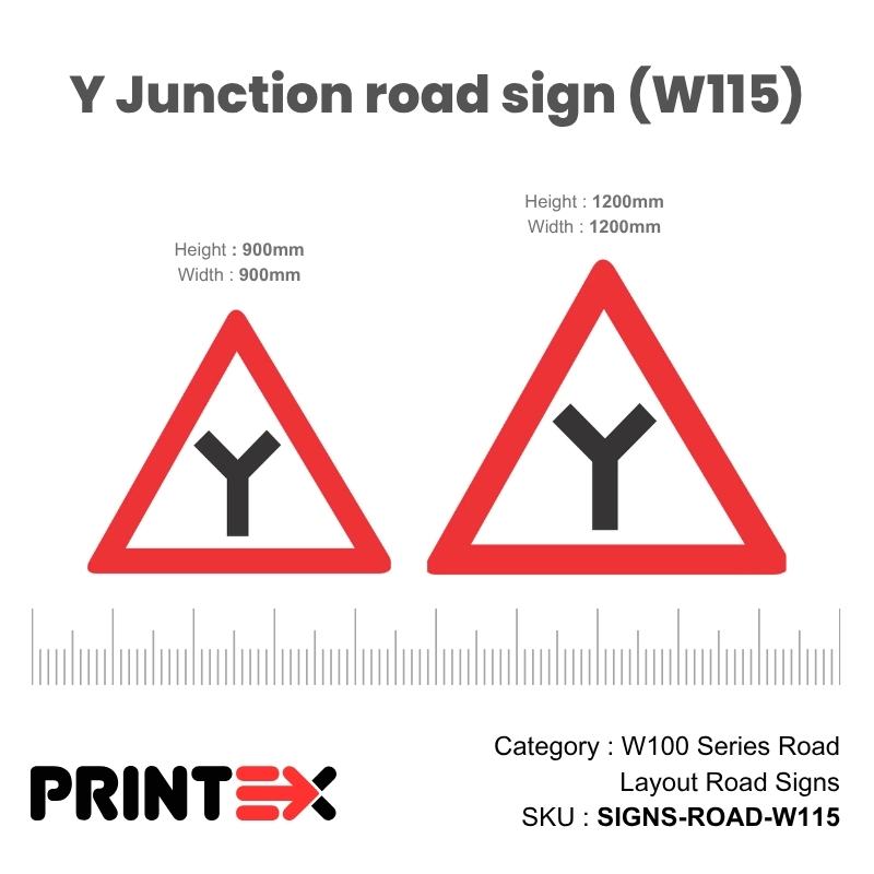 Y Junction Road Sign (W115) play a critical role in alerting drivers to changes in road direction, layout, or structure. These warning signs improve road safety by giving advance notice of curves, junctions, roundabouts, merging lanes, and other potentially hazardous layouts. Recognized by their yellow diamond shape with bold black symbols, W100 signs are essential for highways, construction zones, and high-traffic intersections.